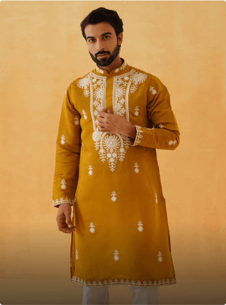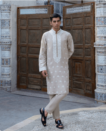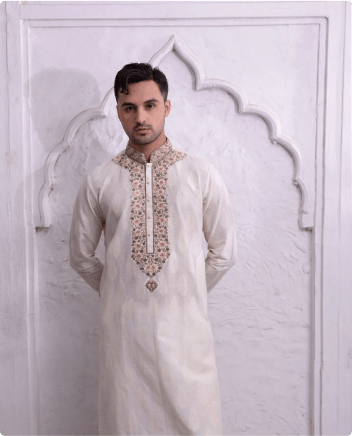 Ivory Off-White Embroidered Kurta Pajama Set for Men