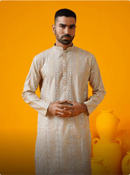Ivory Off-White Embroidered Kurta Pajama Set for Men